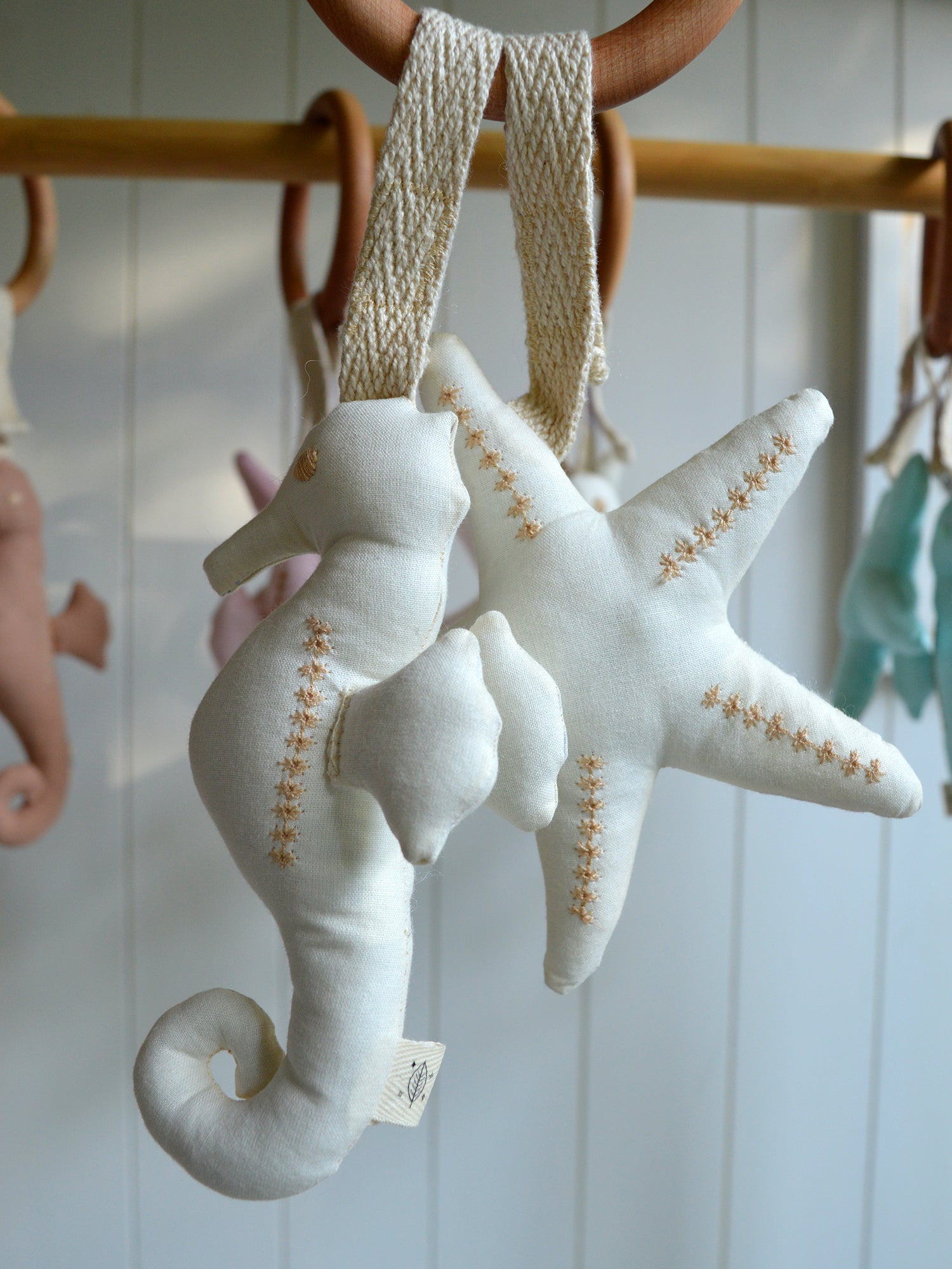 • Figuras de algodón 100 % hipoalergénico, con relleno suave y seguro, y un cascabel interior.