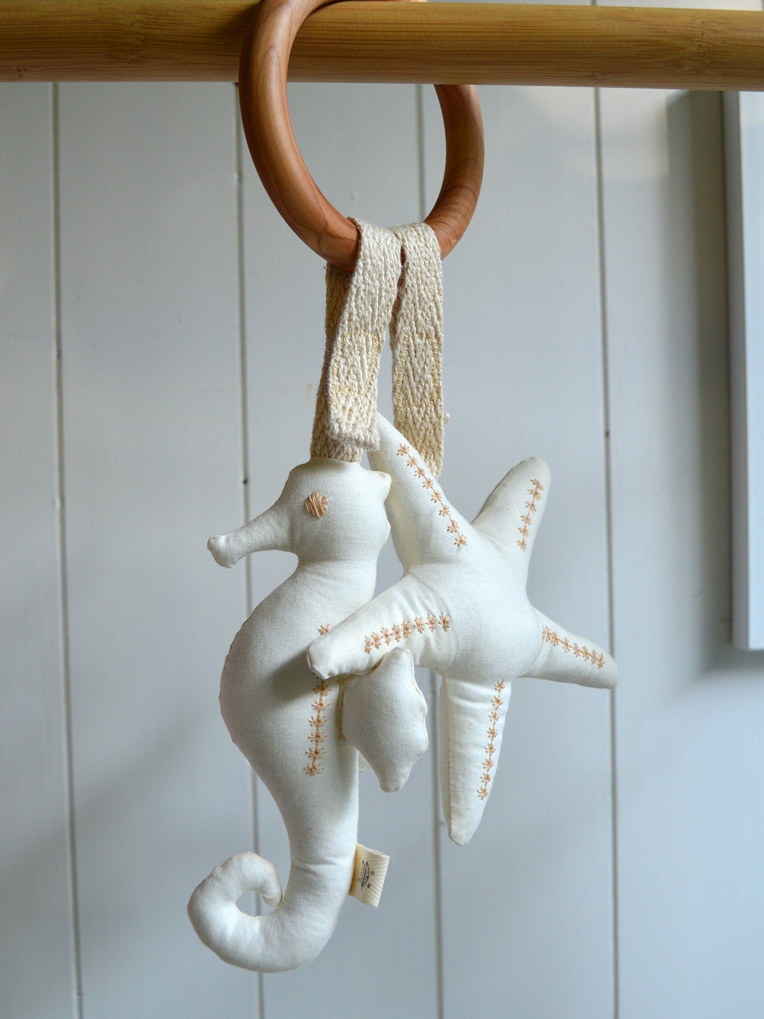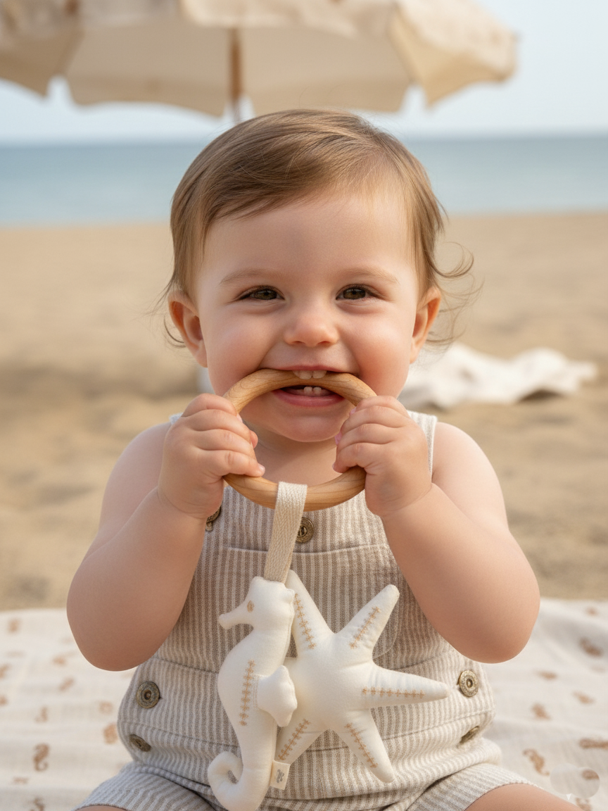 Cada anillo incluye dos figuras: una Estrella de Mar y un Caballito de Mar, colgando de una argolla de madera nativa de lenga (10 cm), perfecta para que tu guagua pueda explorar, morder y aliviar sus encías de forma segura.