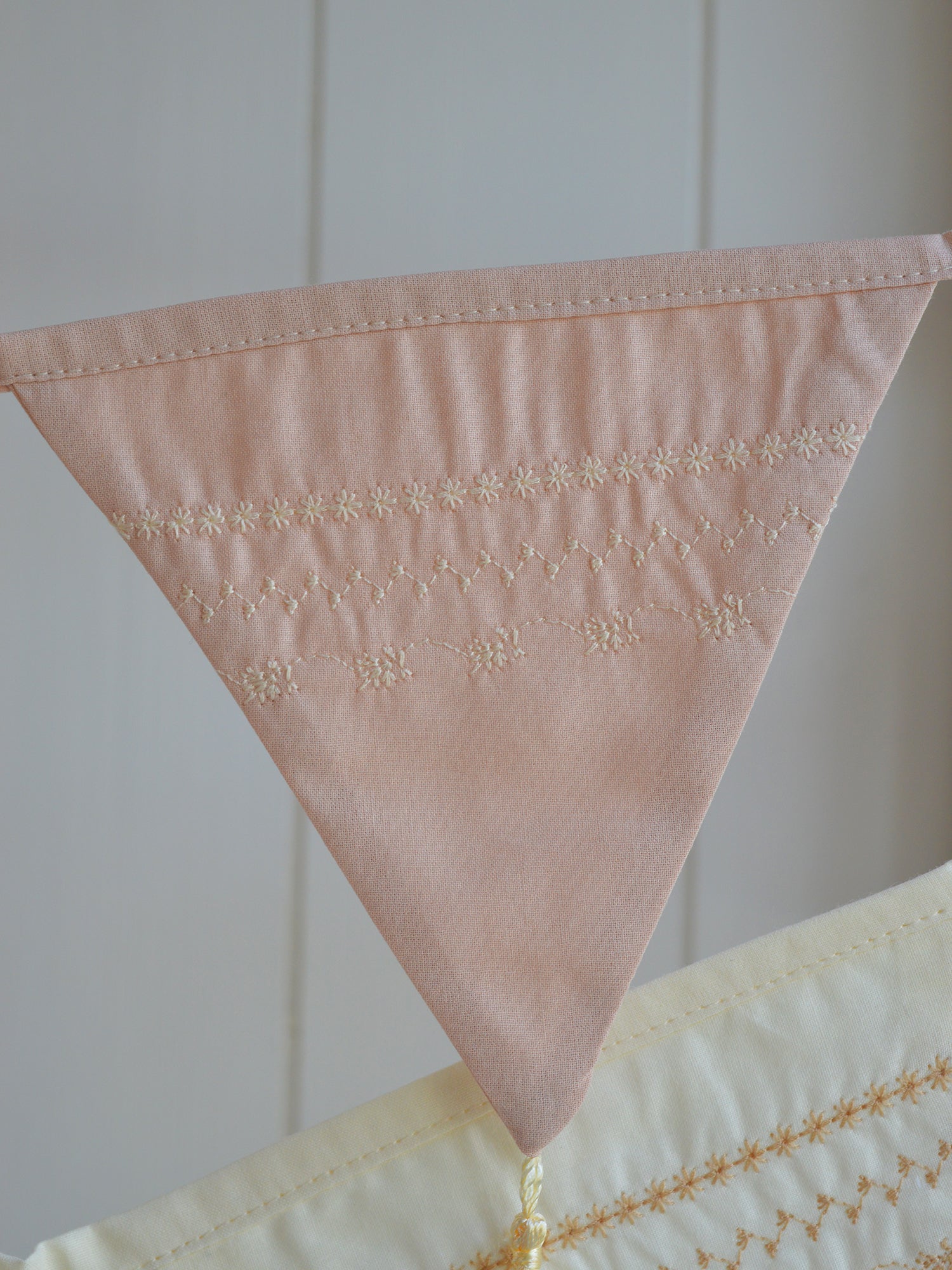 Nuestros nuevos banderines bordados a mano son puro encanto y delicadeza. Con un estilo boho suave y natural, están confeccionados 100% en algodón y terminados con pompones hechos a mano con cuerdas tipo raso en tono beige, que aportan un toque lúdico y acogedor.