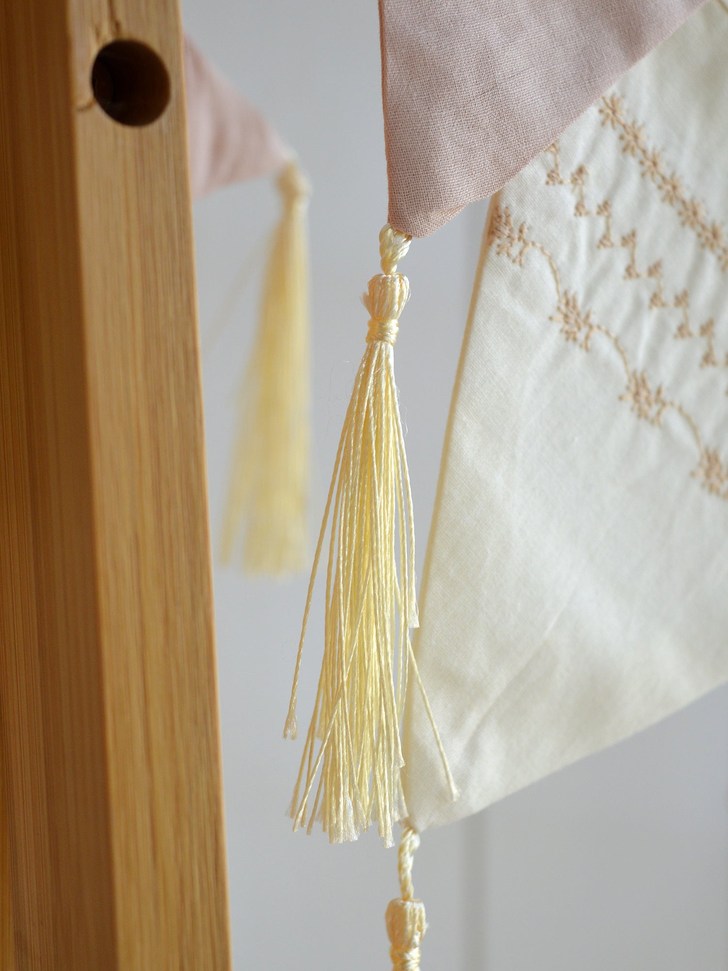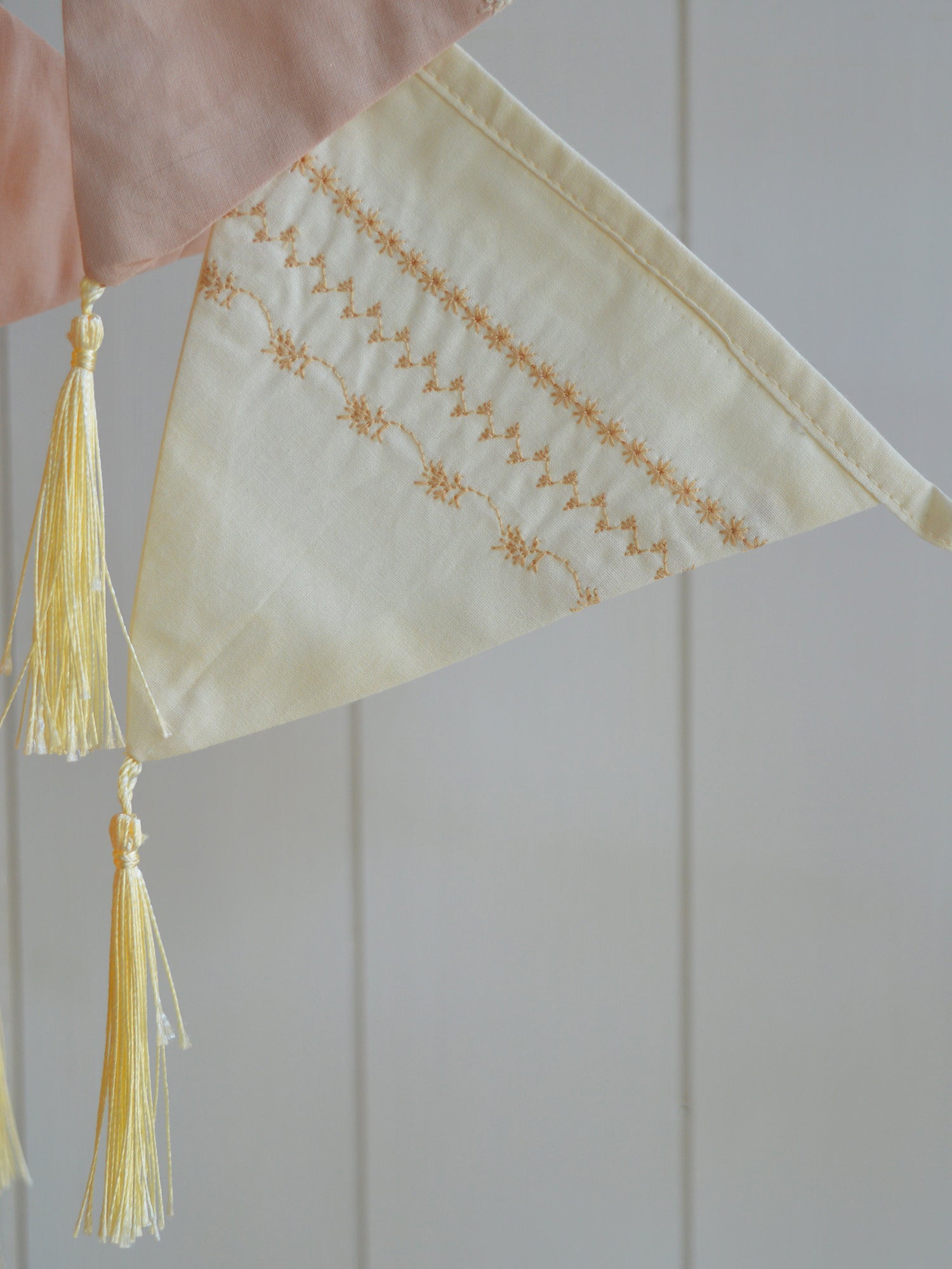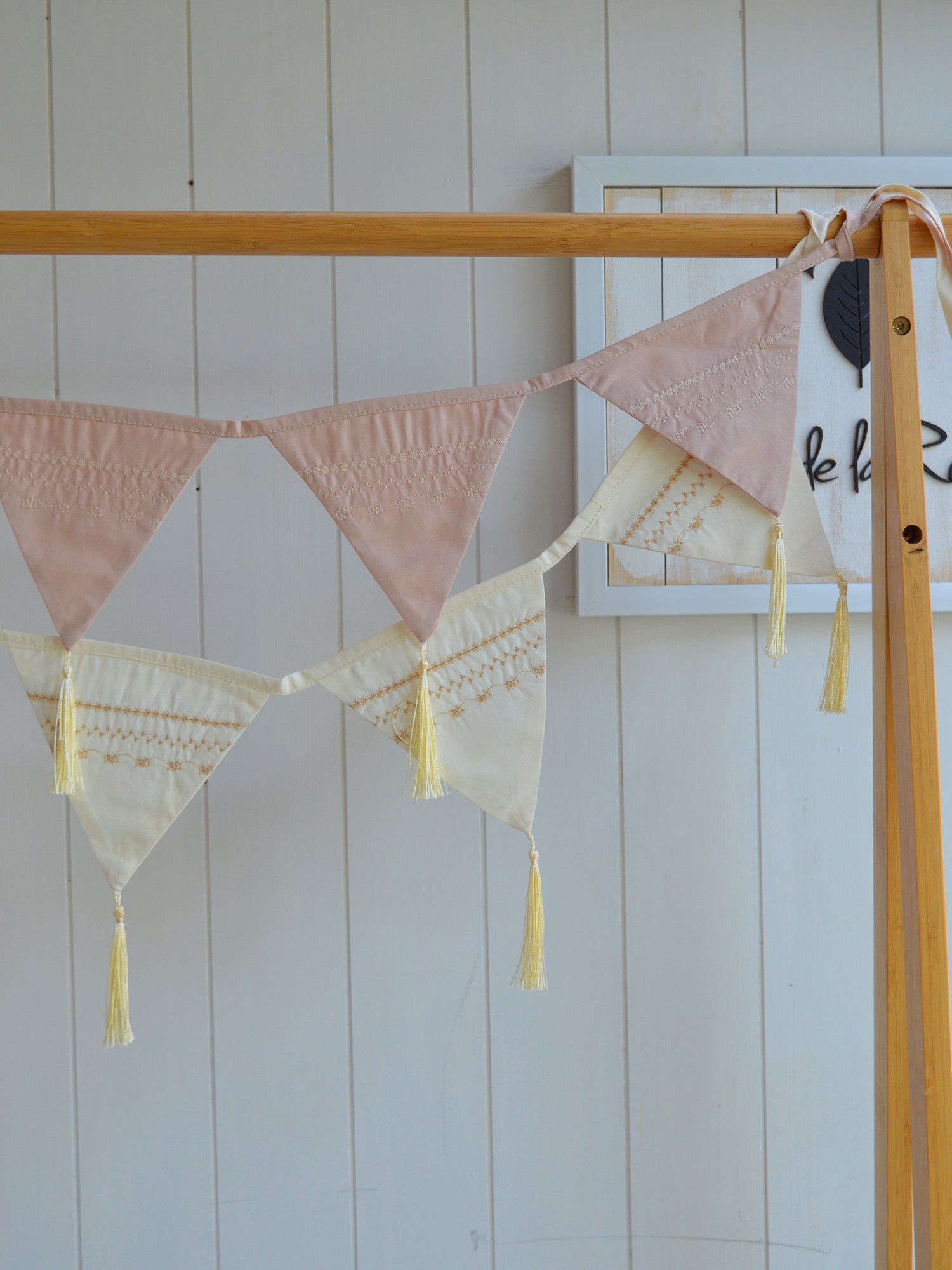 Nuestros nuevos banderines bordados a mano son puro encanto y delicadeza. Con un estilo boho suave y natural, están confeccionados 100% en algodón y terminados con pompones hechos a mano con cuerdas tipo raso en tono beige, que aportan un toque lúdico y acogedor.