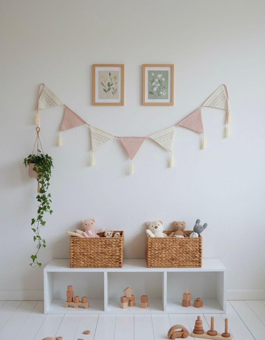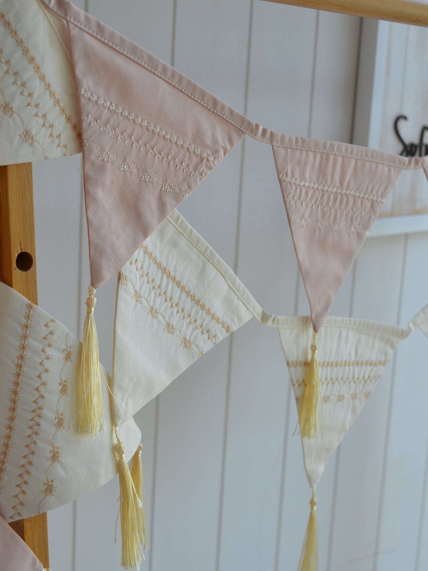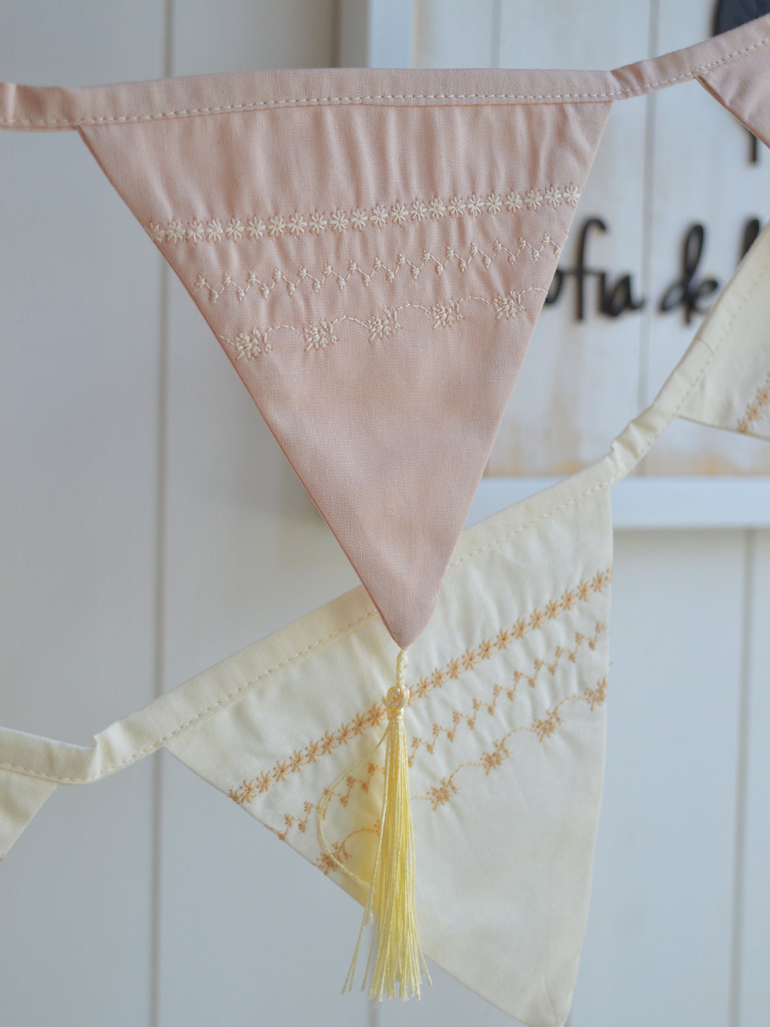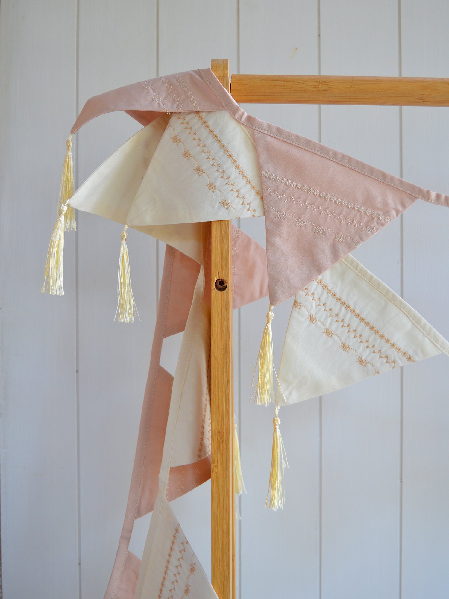 Nuestros nuevos banderines bordados a mano son puro encanto y delicadeza. Con un estilo boho suave y natural, están confeccionados 100% en algodón y terminados con pompones hechos a mano con cuerdas tipo raso en tono beige, que aportan un toque lúdico y acogedor.