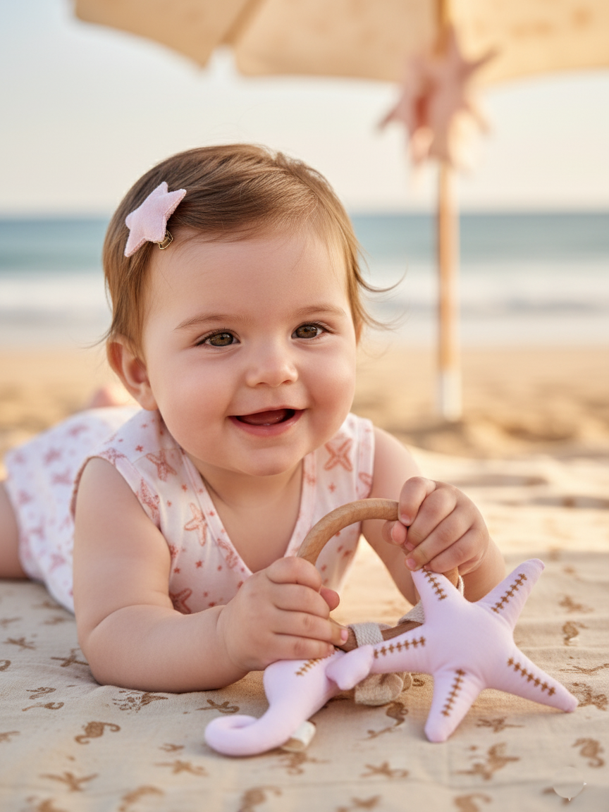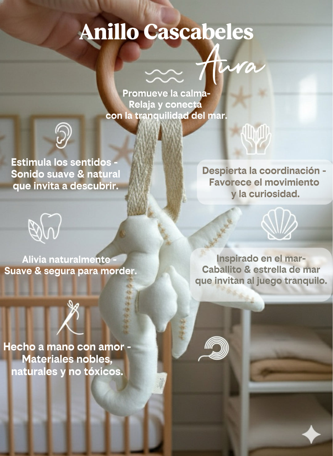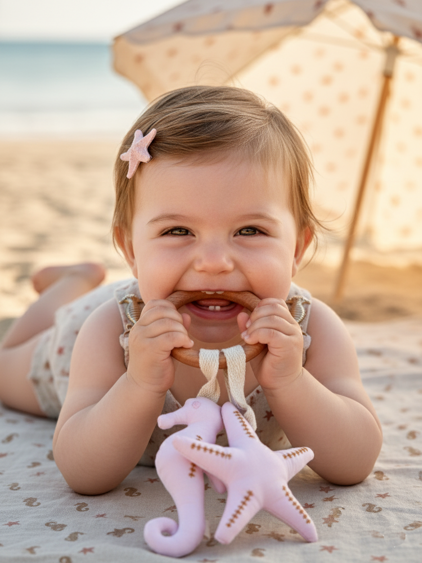 Cada anillo incluye dos figuras: una Estrella de Mar y un Caballito de Mar, colgando de una argolla de madera nativa de lenga (10 cm), perfecta para que tu guagua pueda explorar, morder y aliviar sus encías de forma segura.