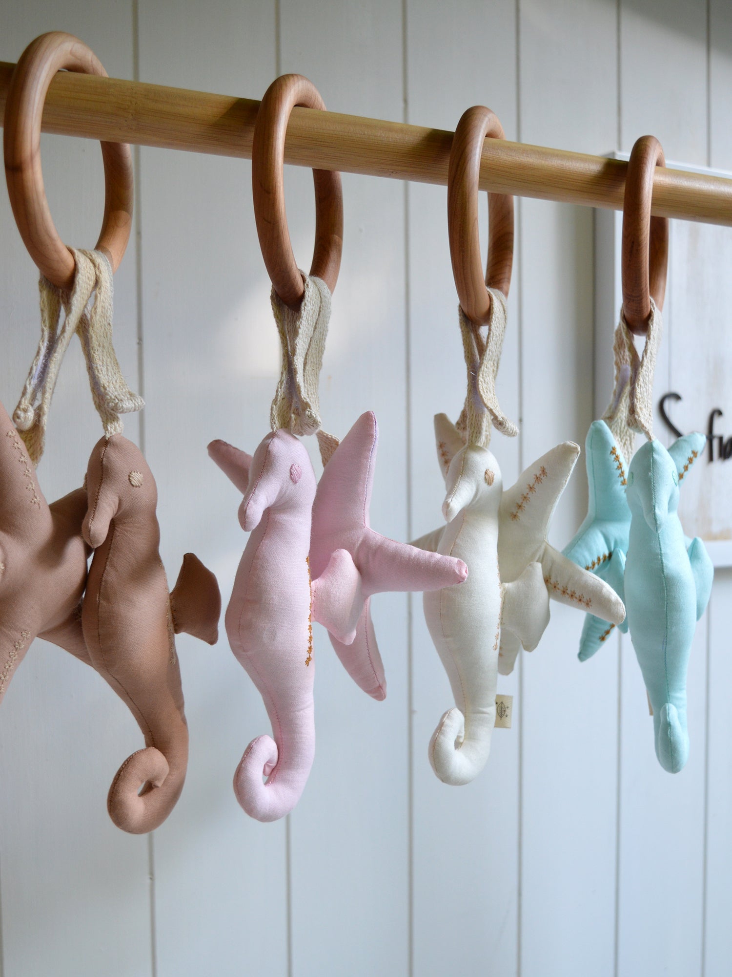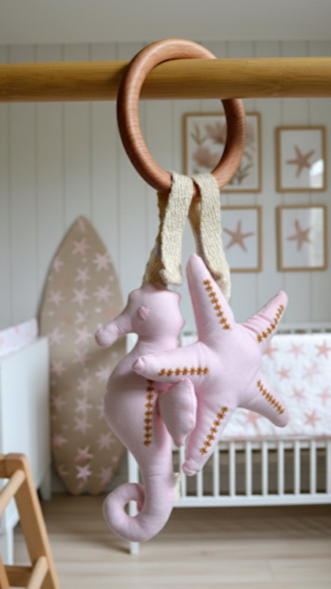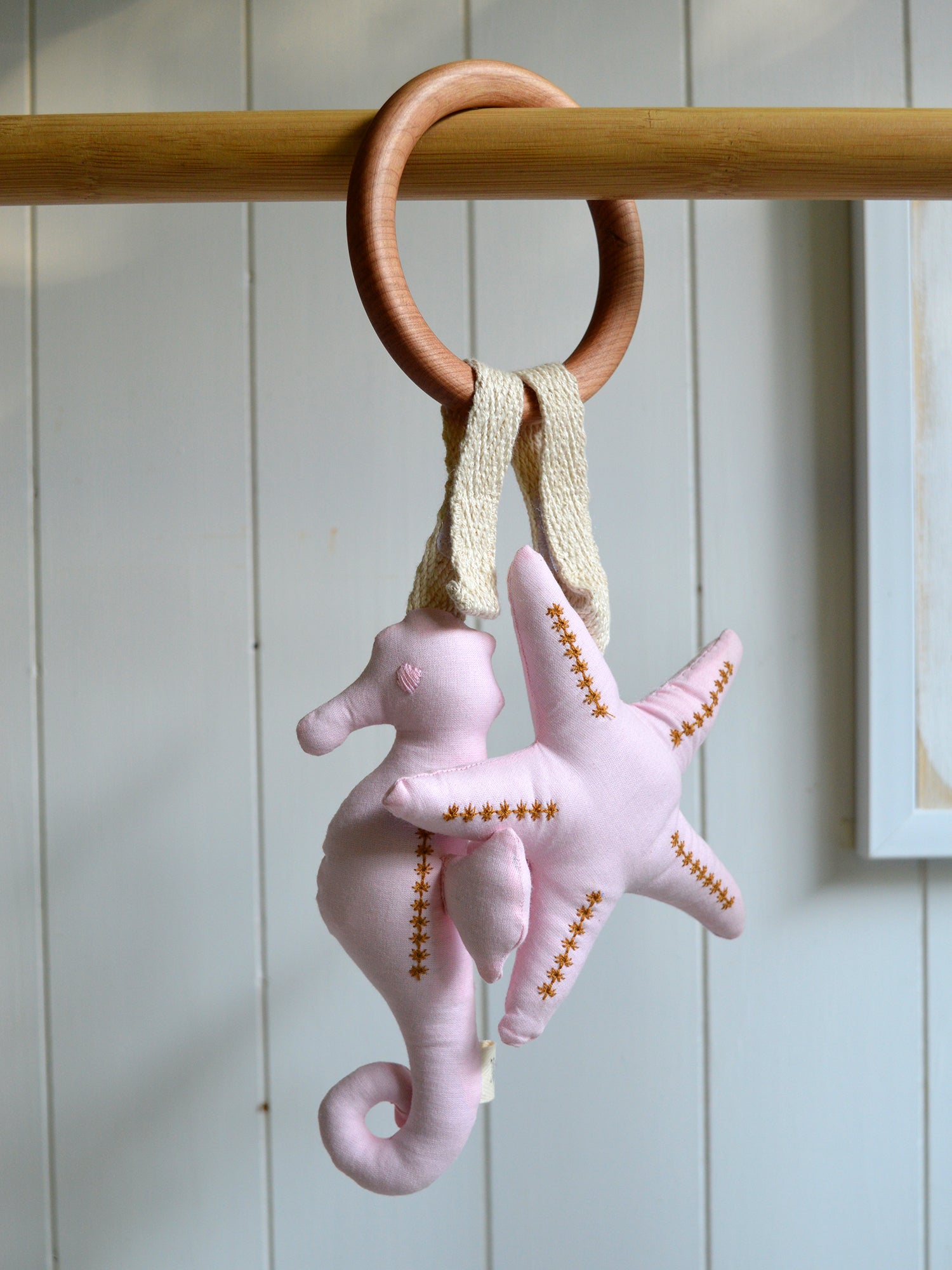 Cada anillo incluye dos figuras: una Estrella de Mar y un Caballito de Mar, colgando de una argolla de madera nativa de lenga (10 cm), perfecta para que tu guagua pueda explorar, morder y aliviar sus encías de forma segura.