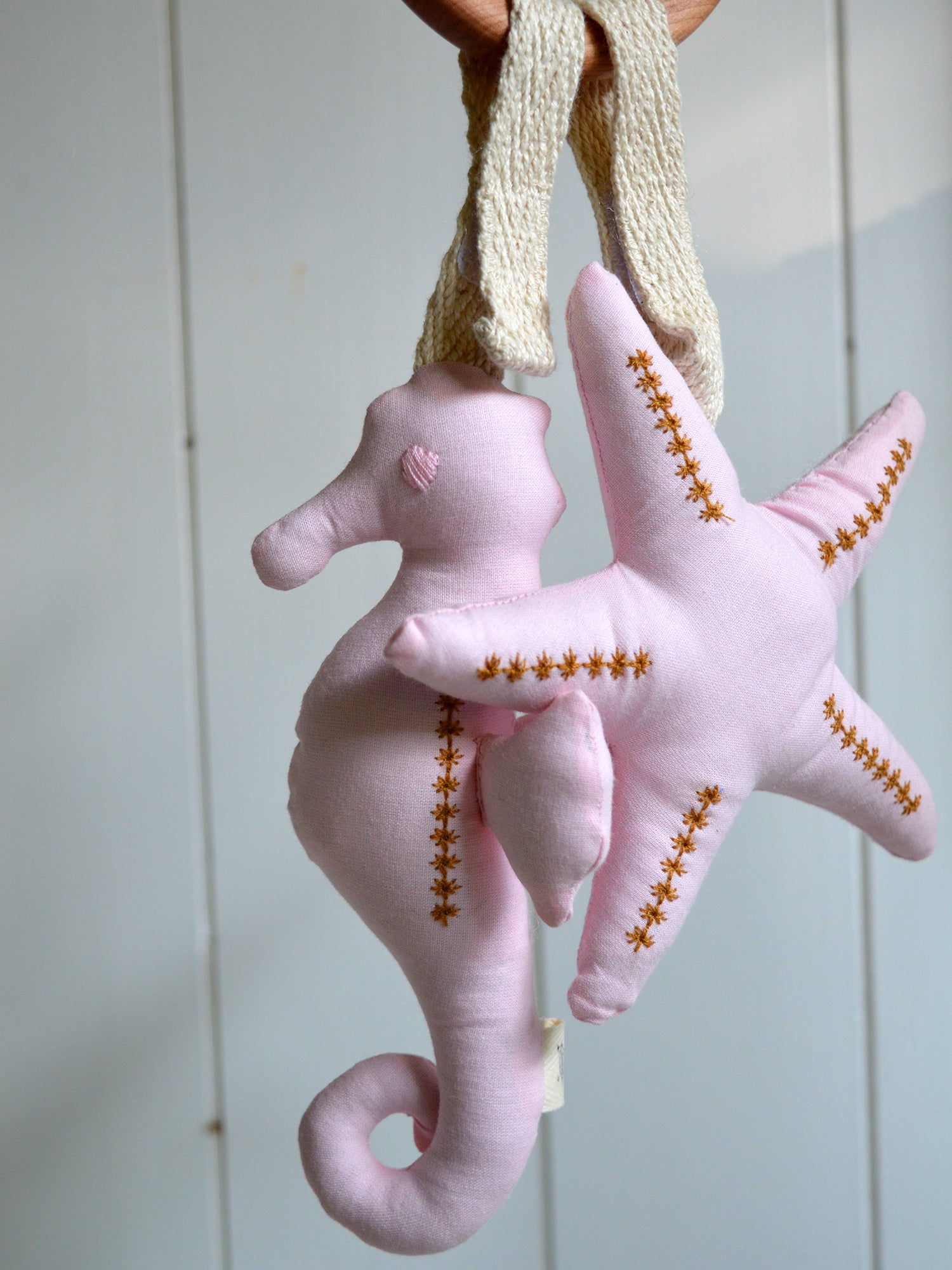 • Figuras de algodón 100 % hipoalergénico, con relleno suave y seguro, y un cascabel interior.