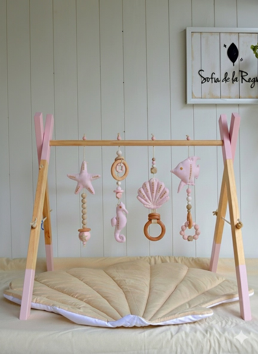 FULL SET GYM: Estructura de 5 piezas + Set de 4 móviles + Play Mat Conchita + Bolso lona transportable