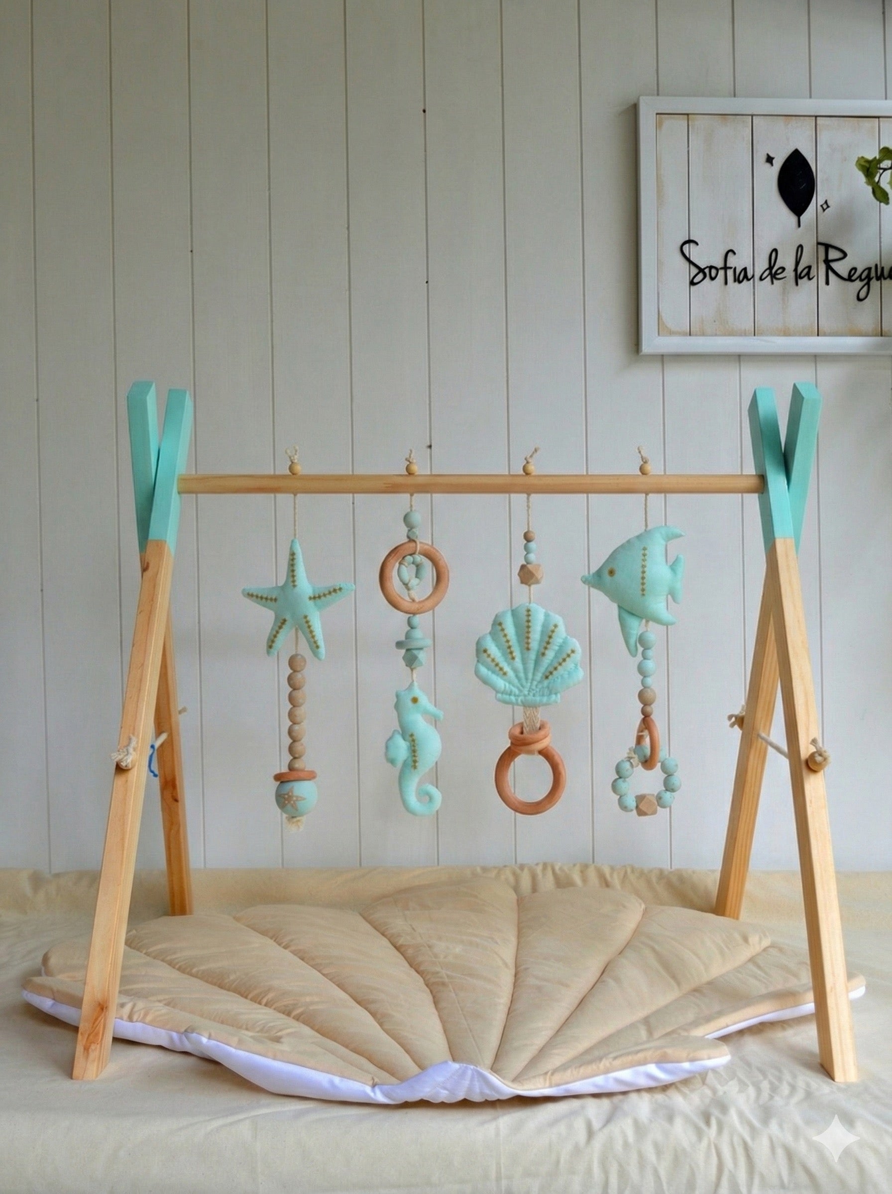 FULL SET GYM: Estructura de 5 piezas + Set de 4 móviles + Play Mat Conchita + Bolso lona transportable